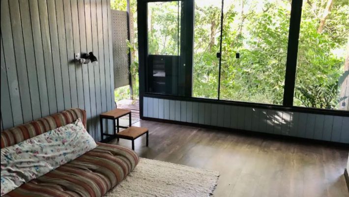 No mezanino (baixo, não dá para ficar em pé), temos um colchão de casal com uma vista linda do Lago Caiçara.